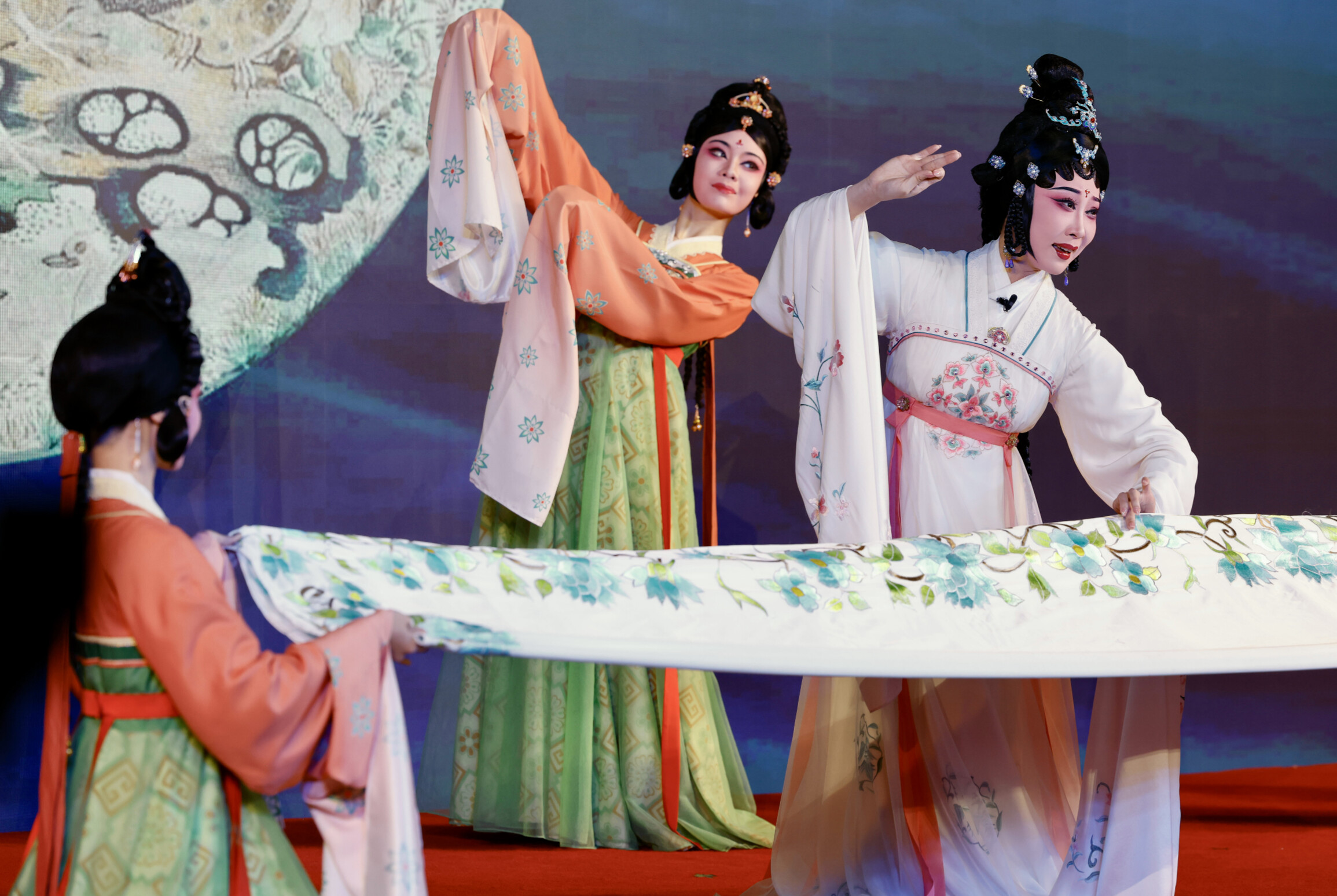 醒狮灵动起舞,英歌铿锵腾跃,在两大岭南非遗亮相迎宾之后,开幕式正式启幕。广州粤剧院带来大型新编古装粤剧《双绣缘》选段,赢得现场阵阵掌声。