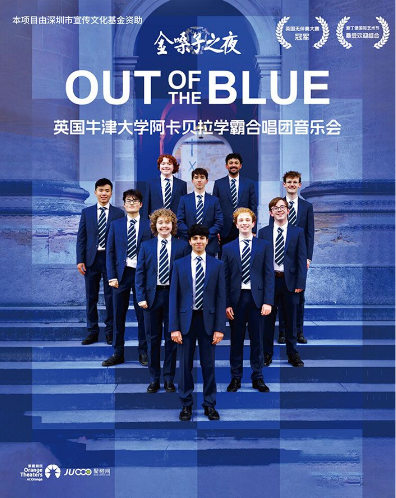 Out of the Blue 作为牛津大学的传奇阿卡贝拉合唱团,同时也是英国夺冠次数最多的无伴奏合唱团,成员皆来自牛津大学和牛津布鲁克斯大学。他们的足迹遍布全球,从伦敦西区到百老汇,从美国、加拿大到法国、意大利、西班牙、瑞士、新加坡等地,所到之处无不收获热烈掌声与高度赞誉。