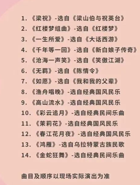 本场音乐会以中西合鸣为主题,创新的编曲与演绎,让传统的国风音乐焕发出新的活力与魅力,国风曲目在保留原曲核心旋律与意境的基础上,加入西洋乐器的和声铺垫,丰富了音乐会层次感与表现力。