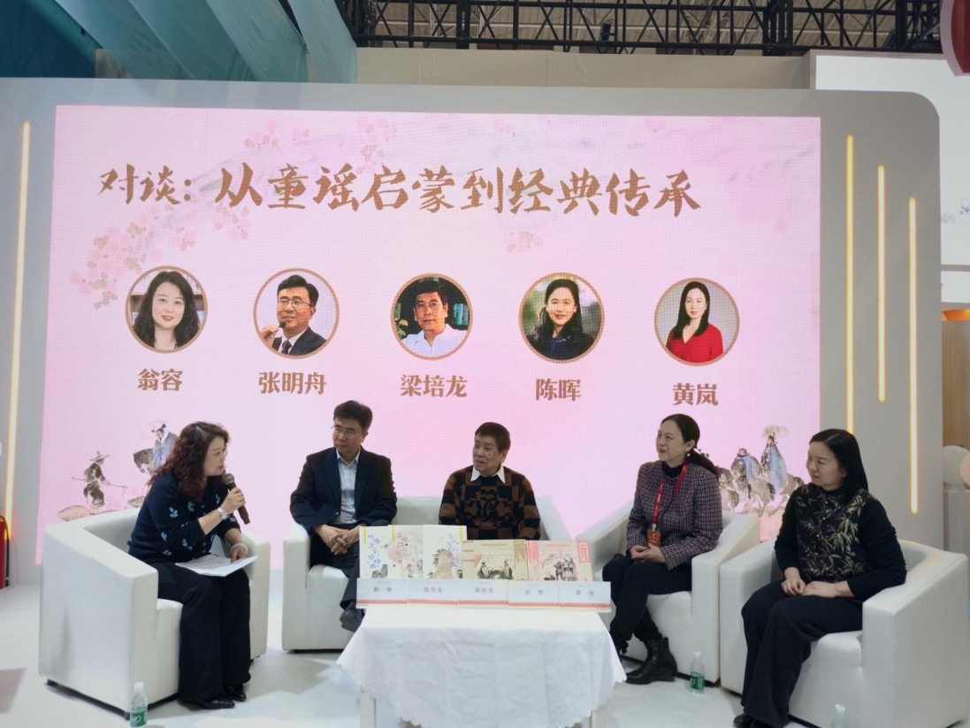 活动现场,嘉宾们围绕创作理念与文化传承展开深度交流。深耕儿童题材水墨画创作50余年的梁培龙分享道,水墨写意性与儿童天真气息高度契合,此次创作特意用笔墨区分“启蒙”与“进阶”质感,让传统笔墨“放下身段”,既保留中式韵味又满是童真。“国画童谣绘本系列”作者黄岚结合教学经验谈到,童谣创作注重音韵美、意境美与精神美,与水墨画结合形成的“诗画一体”形式,能增强孩子的汉字图像联想,助力中式美学直觉培养。陈晖则坦言,将三国这样的厚重经典改编为儿童绘本,核心挑战在于“取舍”,需在保留原著韵味与适配现代儿童阅读需求之间找到平衡,让绘本成为连接孩子与经典的纽带。