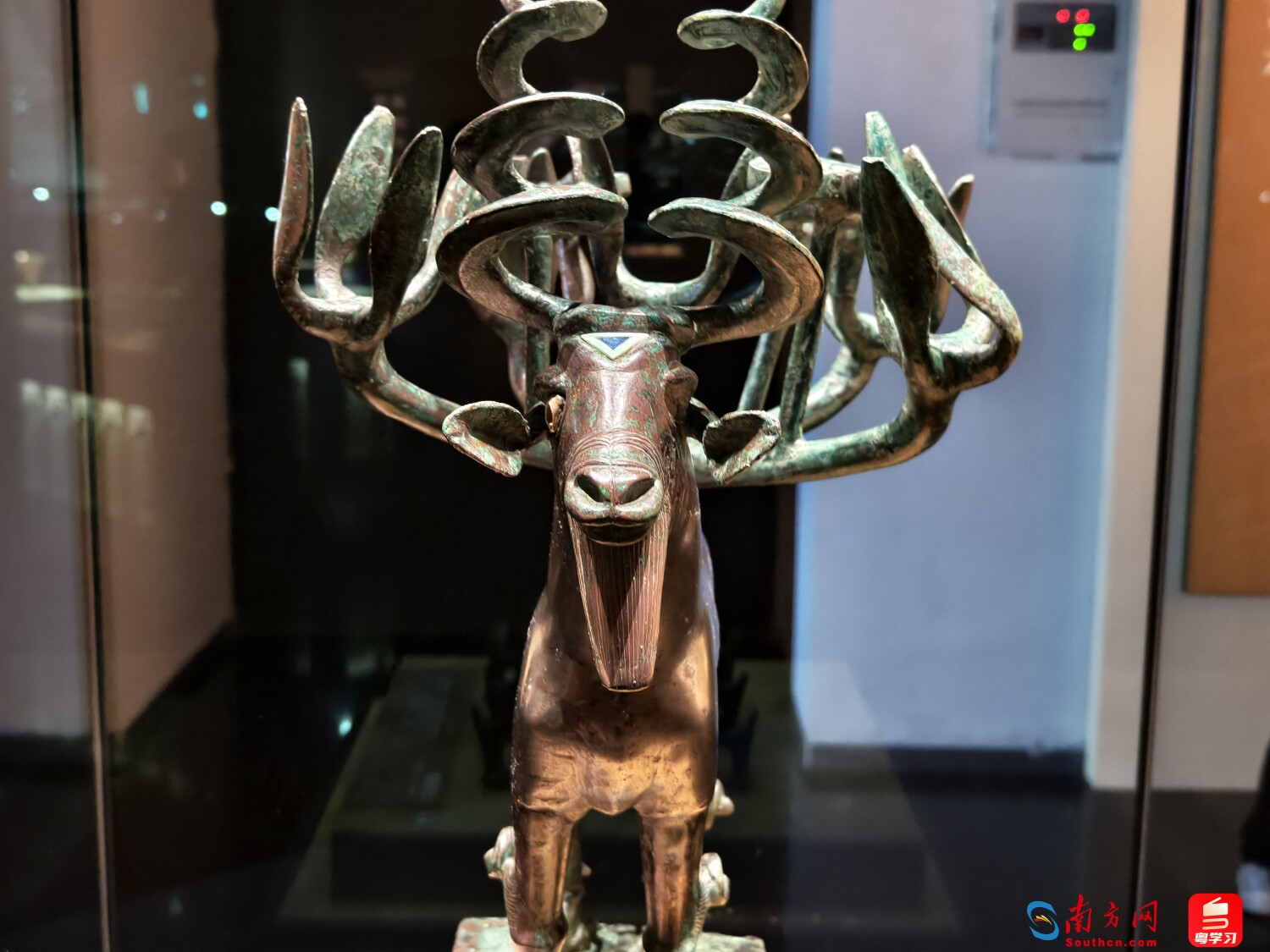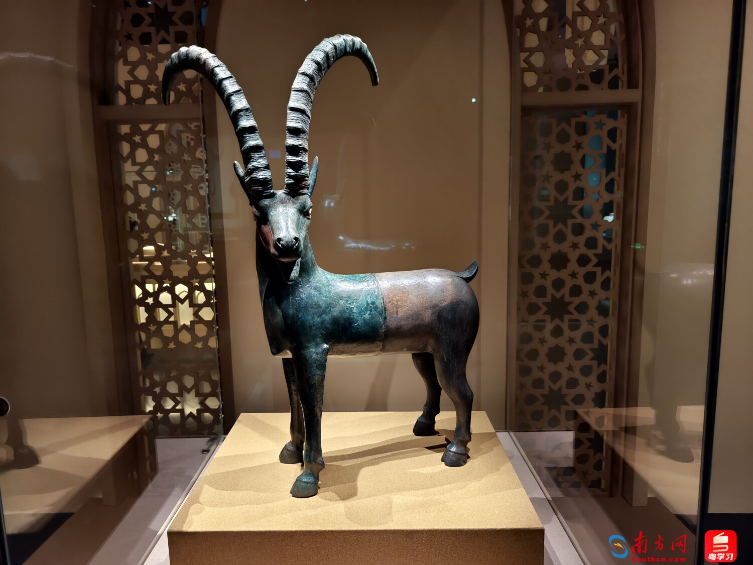 走进展厅,马露霞站在一件重磅展品青铜野山羊立像前介绍,该展品来源于南阿拉伯地区,“这件动物造型的青铜像非常写实,眼睛还镶嵌了青金石这类宝石,它前半部分是完整的,后半部分用了木头修复。展品上还有献祭铭文,代表了南阿拉伯地区对古代神灵的崇拜信仰。”