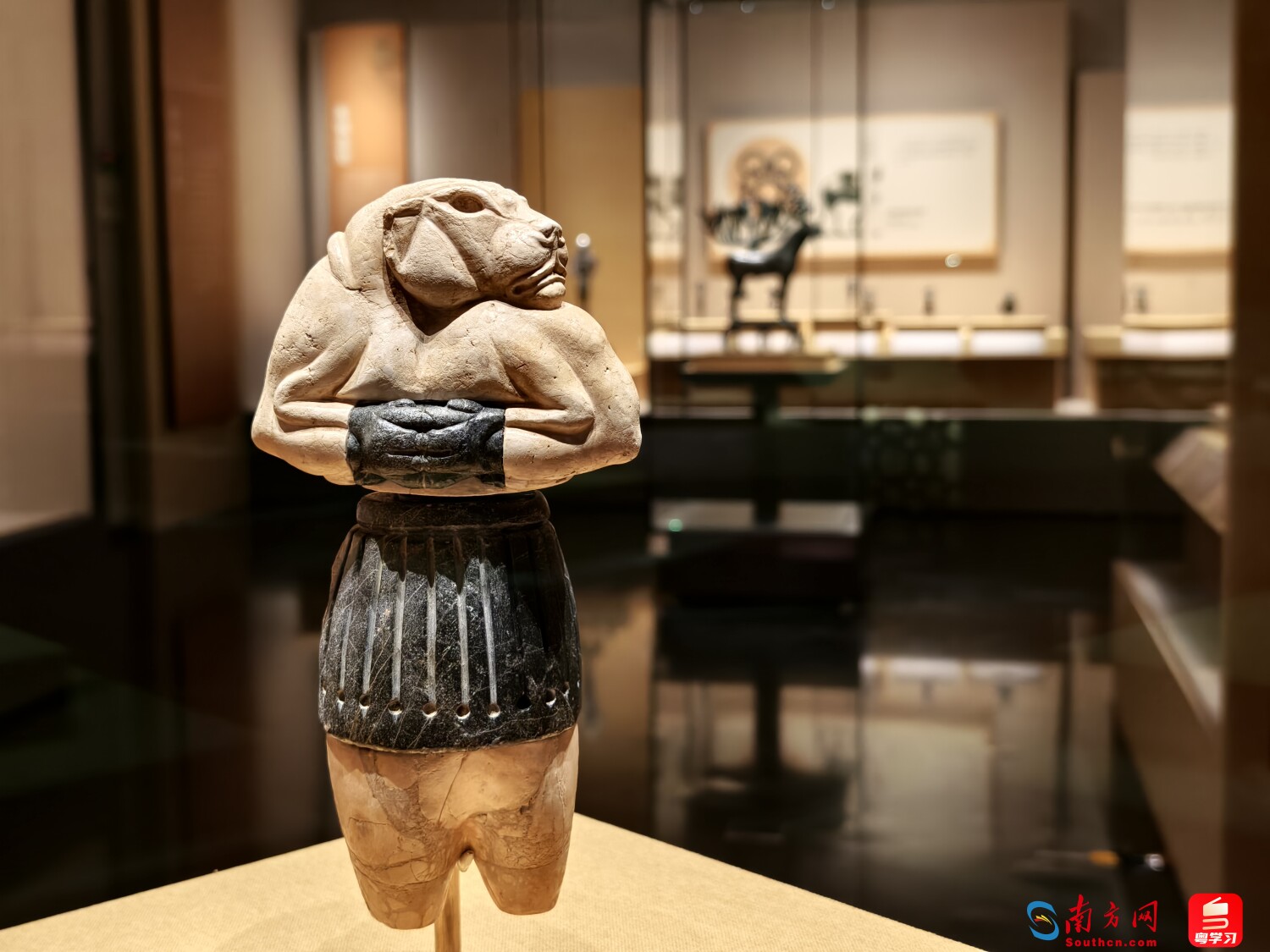 “在青铜野山羊立像附近,我们还展出了被誉为葛诺母狮‘姐妹版’的母狮妖像,工艺精湛,是研究古埃兰王国厚重历史与工匠技艺的重要实物。”马露霞表示,粤博展出的母狮妖像与葛诺母狮在造型上非常相似,而且比葛诺母狮的尺寸还要大,“葛诺母狮在2007年可是拍出了史上最高价(5720万美元,折合人民币4亿多元),被认为是古代世界中最古老、最重要的雕塑作品之一。”
