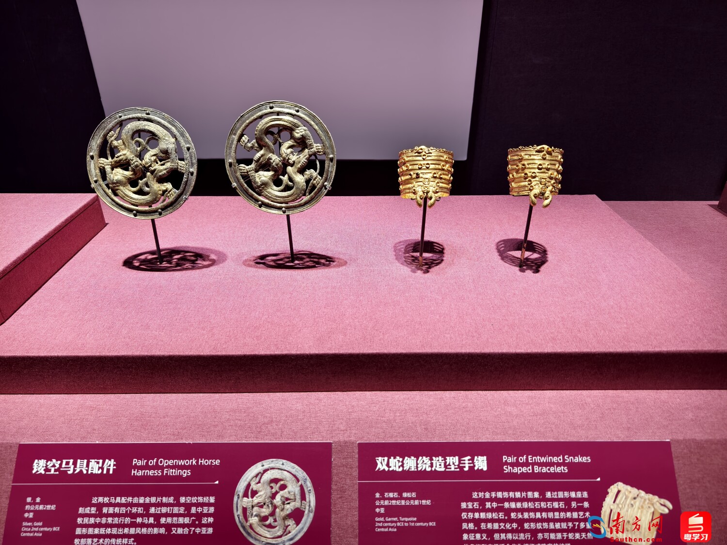 “铜石并臻”篇章聚焦从石器时代到青铜时代转变的石刻雕塑和青铜器,再现早期文明在石刻雕塑、金属艺术等领域的美学工艺。“帝国华章”篇章通过埃兰王国、巴比伦王国、亚述帝国、阿契美尼德王朝等早期帝国的金银器,展现了当时的精湛工艺和王权的财富象征,以及其与周边地区的文化交流。“希腊荣光”篇章展出希腊化时期精美绝伦的珠宝首饰和生活用具,这些珍宝不仅展现了希腊文化的独特魅力,还融合了东方元素,成为世界珠宝艺术史上的璀璨篇章。“波斯华彩”篇章着重讲述萨珊王朝的艺术风格,并揭示了其通过丝绸之路与唐朝的交流互鉴。