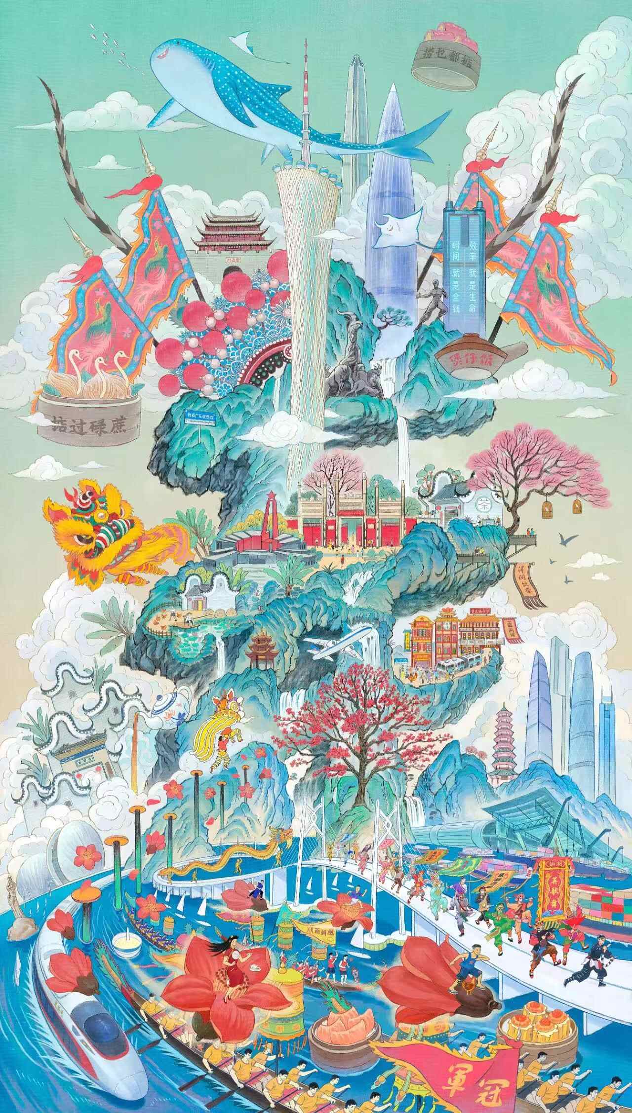 其中特邀作品《我的宝藏家乡-广东》由人民日报社新媒体2024年出品,第二届CIAC优秀奖作者梁海强创作,将粤剧、镬耳屋、骑楼、醒狮、潮汕英歌舞等传统文化,龙舟、早茶、木棉花等烟火气息,以及广州“小蛮腰”、深圳“春笋”等现代化建筑融为一画,细节充沛,气势非凡。