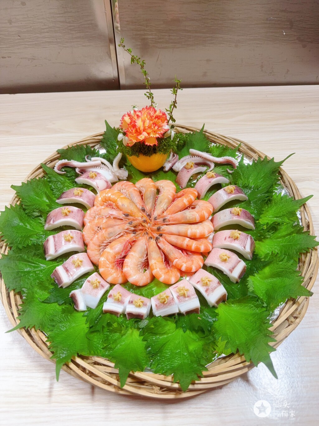 寓意:环形拼盘象征团圆满与鱼虾满仓的丰收;五彩番茄和康乃馨寄寓花开富贵,生生不息,承载潮汕人敬重自然的智慧传承。这不仅是海鲜盛宴,更是一幅潮汕风物诗画竹篮载海味,紫苏托云霞;双环扣圆满,全球是一家。