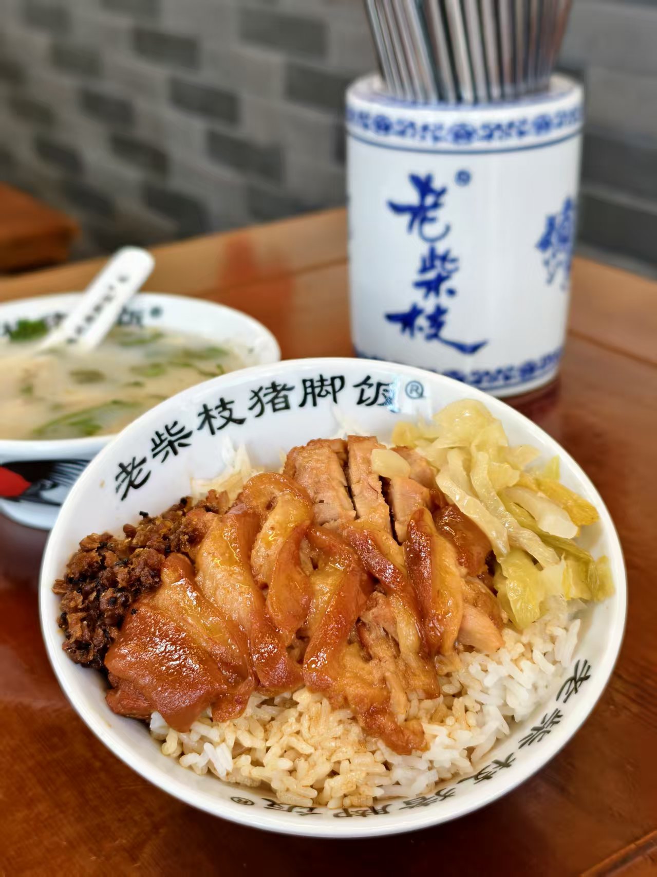 介绍:老柴枝猪脚饭制作技艺为市级非遗项目。卤水配方由祖辈相传讲求鲜香浓郁、回味甘甜;精选皮白浑圆之猪后脚,经过多道工序去毛去杂味,根据结构改刀,放入卤水经过3个多小时熬制渗透;搭配泰国香米,以及用泰国香米熬出清香的米汤加入新鲜汫洲珠蚝的蚝汤;腌制小菜作为佐料,酸爽适口,蒜泥炒制菜脯粒,咸香扑鼻,是典型的潮汕风味制作技艺。