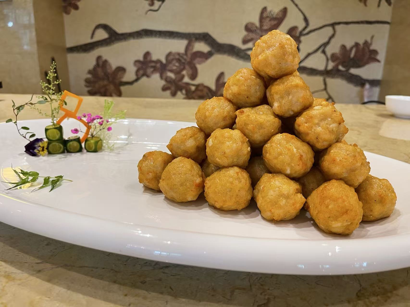 介绍:丸中聚宝是一道融合四款手工丸子(非遗猪肉丸、墨斗丸、马鲛鱼丸、黑虎虾丸)的丸子龙须菜汤。