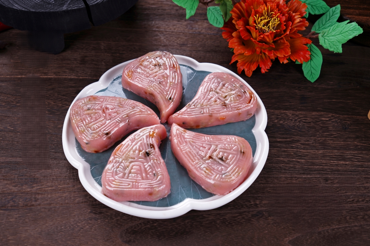 介绍:红桃粿是潮汕地区比较常见的粿品之一。其得名有三,其一是因为在制作的过程中加了一种红色的食用染料,其二是因为形状为扁桃形,其三因为是大米做的粿品,所以也叫“粿”。红桃粿有长寿的寓意,潮汕人常用来拜神祭祖,祈求家人平安长寿。每逢佳节,潮汕人也常常将红桃粿作为礼品分发给亲朋好友,作为对彼此之间的祝福。潮味成古韵、桃粿贺新春,礼遇八方客、尽显潮汕情。