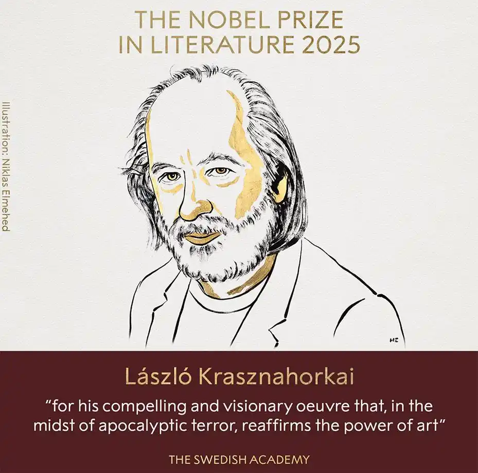 瑞典文学院10月9日宣布,将2025年诺贝尔文学奖授予拉斯洛·克拉斯纳霍尔凯(László Krasznahorkai ),获奖理由是“因其引人入胜且富有远见的作品,在末日般的恐怖中,再次彰显了艺术的力量”。