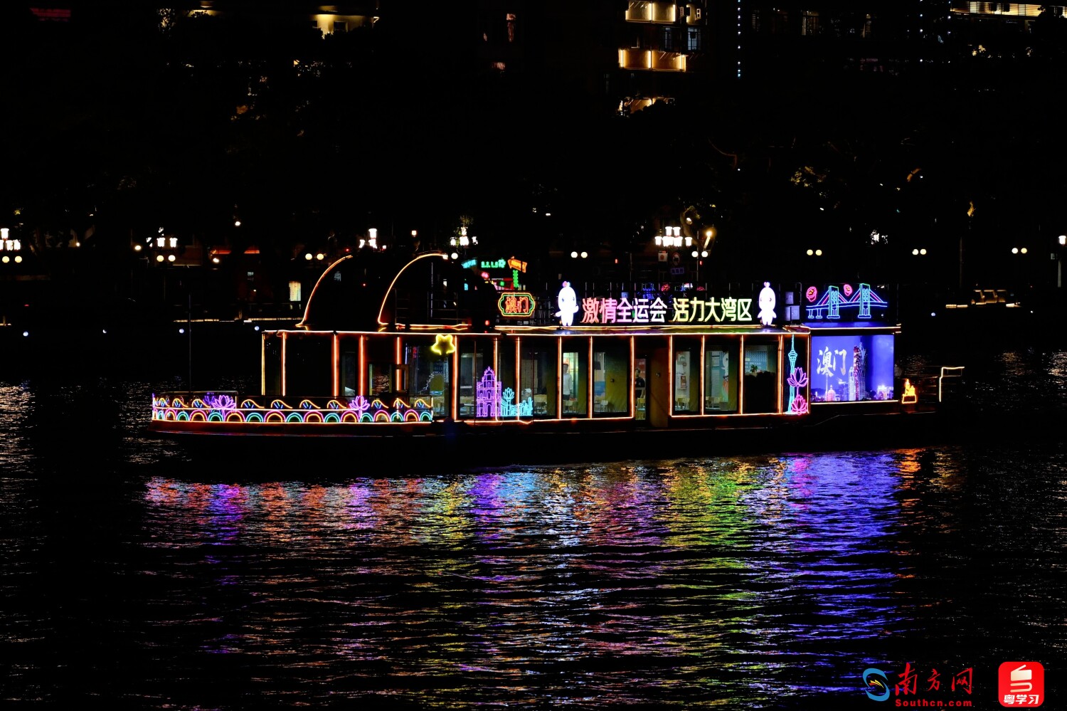 此外,船身呈现的全运会口号及吉祥物造型,进一步强化了赛事氛围,而动态闪烁的 “广东”“香港”“澳门” 艺术字体标识,更凸显了三地作为赛事承办区域的重要地位,彰显大湾区同心聚力的深厚情谊。