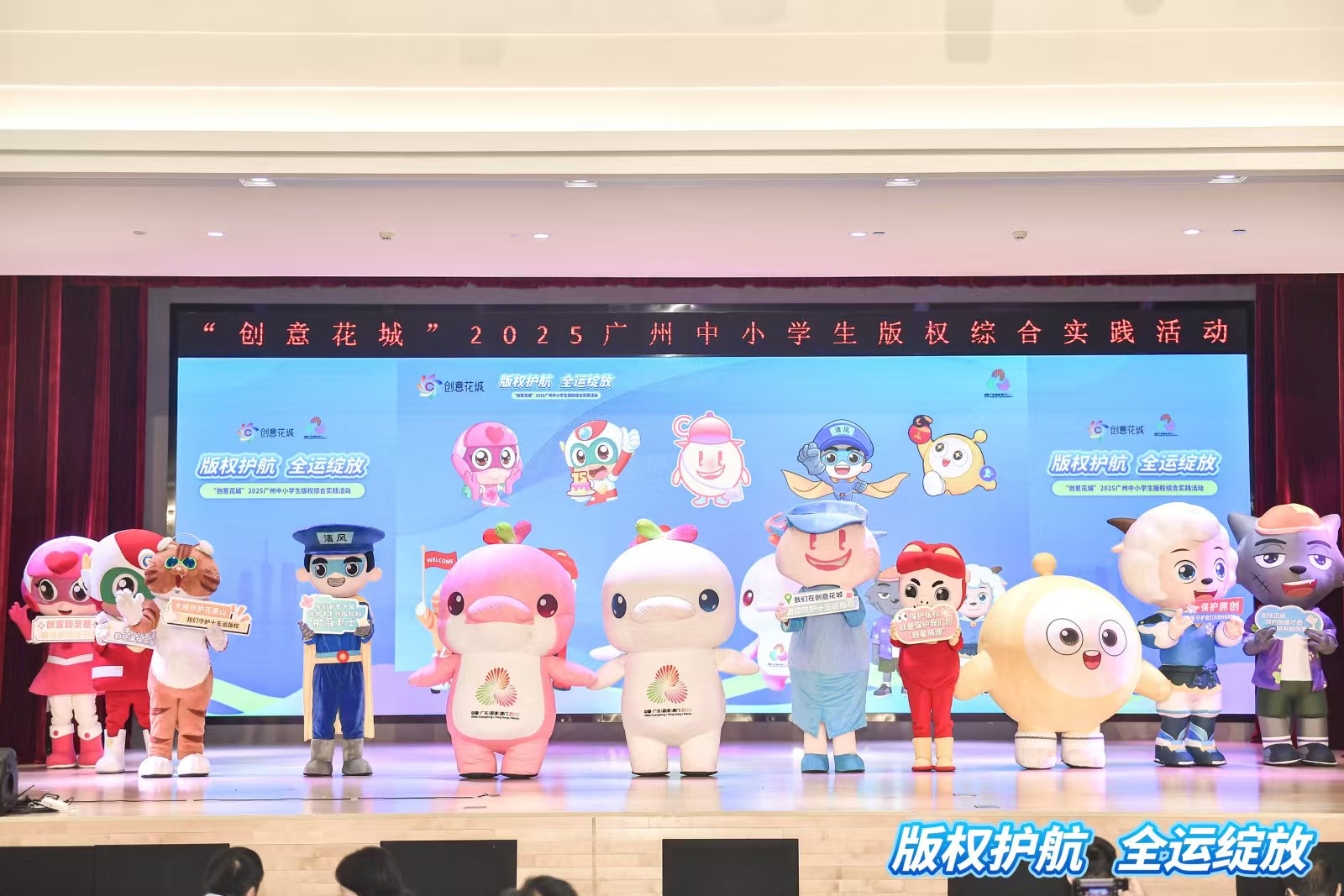 随后,伴着孩子们的欢呼声与掌声,猪猪侠、喜羊羊与灰太狼、蛋仔派对、开心超人与甜心超人、花果山大橘等动漫游戏形象,广州版权形象IP版仔、广州“扫黄打非”代言人“清风侠”以及十五运会吉祥物喜洋洋、乐融融,集体亮相“动漫游戏IP天团共倡十五运版权保护”互动环节。他们发出“保护版权,就是保护超星萌宠的家”“支持正版,让青青草原的创意不被偷走”“我们在创意花城邀您共护十五运版权”“保护十五运版权我们在一起”等倡议。一个个熟悉的动漫游戏形象轮番发出版权保护倡议,不仅瞬间激发了同学们对版权知识的浓厚兴趣,更让大家真切感受到“版权保护就在我们身边”。现场小观众纷纷举手呼应,原本严肃的版权宣传,变成了一场充满欢乐与互动的“版权派对”。