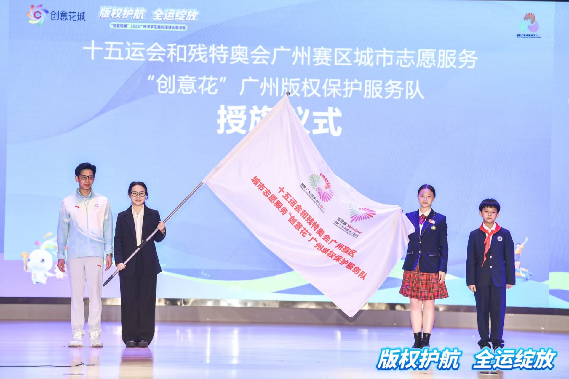 活动现场,除了动漫游戏IP联动,十五运会和残特奥会广州赛区城市志愿服务“创意花”广州版权保护服务队队旗,也在活动现场挥舞着。为发动社会各界参与到保护十五运会版权的行列之中,在广州市版权局指导下,广州市版权保护中心发起成立十五运会和残特奥会广州赛区城市志愿服务“创意花”广州版权保护服务队,吸纳广州大中小学生及社会各界共同参与全运版权保护志愿服务。授旗环节,广东财经大学陈紫严、广州实验中学谢沁之、海珠区逸景第一小学郑芷煊三位志愿者代表接过旗帜。