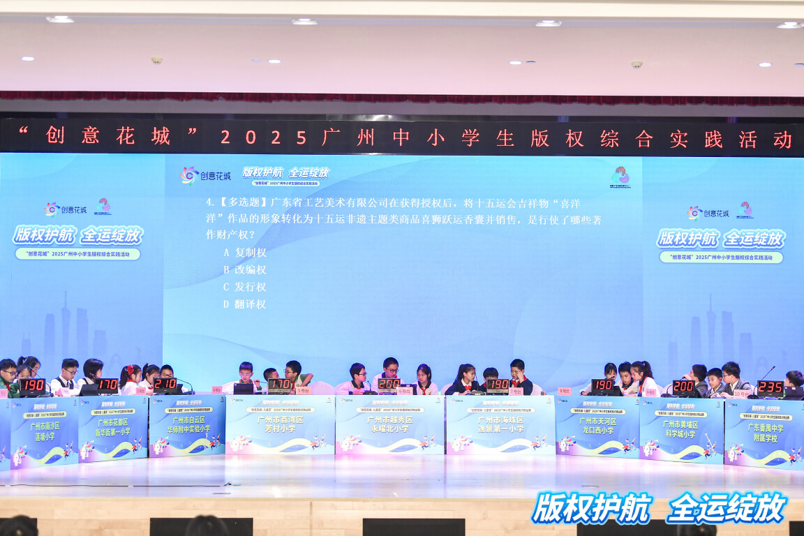 “创意花城·儿童答”2025广州小学生版权知识挑战赛也同样精彩,来自广州各区的11支小学生代表队齐聚赛场,现场比拼版权知识储备,将严肃的版权教育转化为充满趣味的互动体验。赛事紧扣版权、全运及体育赛事主题,一道道题目既是对版权知识的考查,更是对日常行为的引导。最终,广东番禺中学附属学校代表队获得冠军。