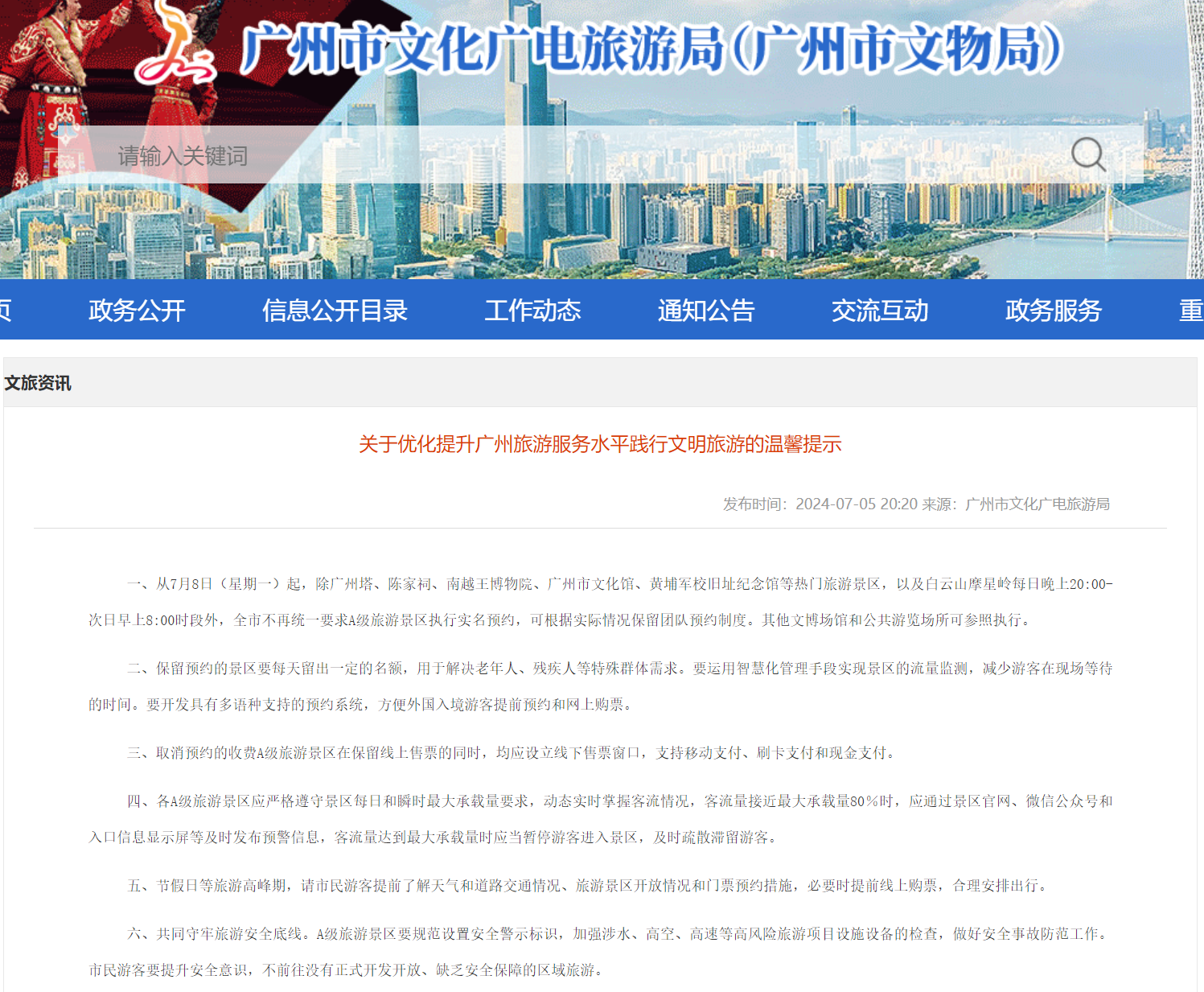 7月5日晚,广州市文化广电旅游局发布《关于优化提升广州旅游服务水平践行文明旅游的温馨提示》(以下简称《提示》)。