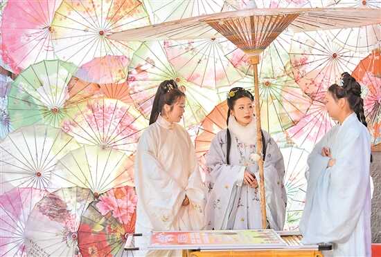 游客身着传统服饰在湖北省宣恩县城兴隆老街上游玩