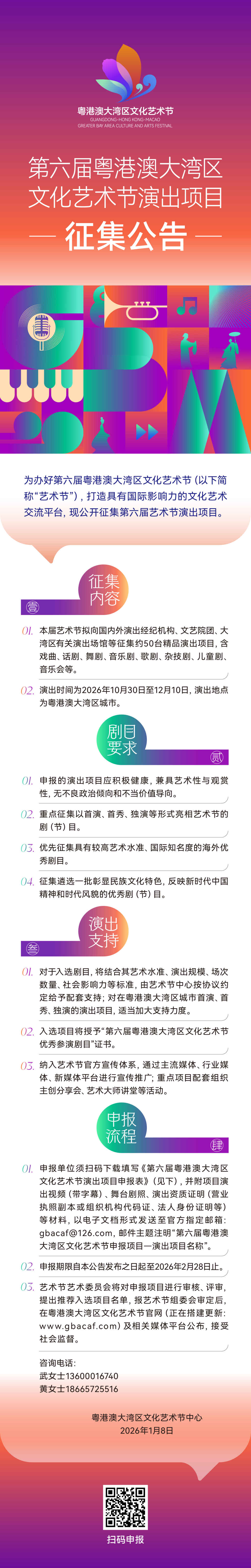 1月8日,第六届粤港澳大湾区文化艺术节正式启动演出项目全球征集,一场汇聚多元艺术的湾区文艺盛宴即将启幕。