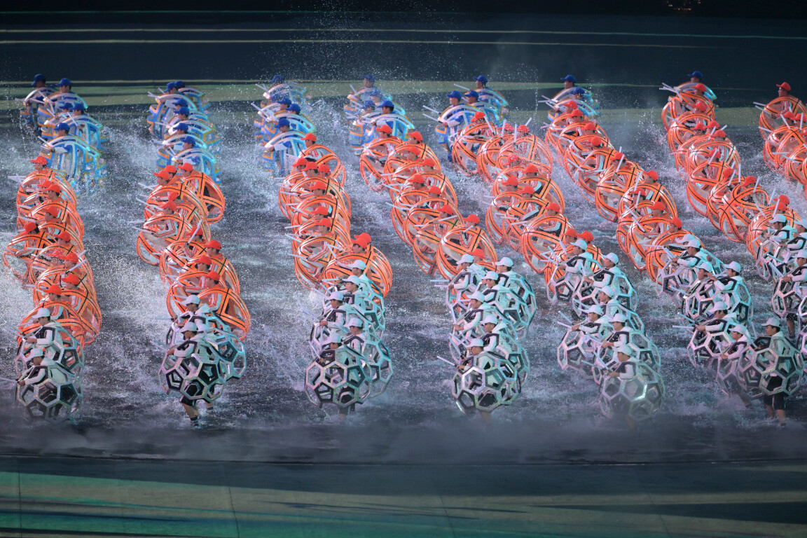 总制作人王锐祥分享了这一设计背后的巧思——“水舞台”的设计践行了本次开幕式“简约”的核心理念,用创意而非人海战术来营造饱满的舞台效果。他解释道:“体育场空间宏大,容易显得空旷。环形舞台的视觉引导,能将观众视线从超过2万平方米的场地,聚焦至5000平方米的核心表演区。仅3000多名演员在广阔的体育场里,也可以演出千军万马的声势。”效果堪称“四两拨千斤”。
