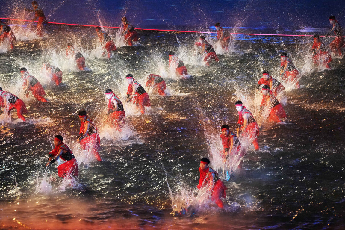 中华白海豚追随着文明之船,在海水里跳跃;鳌鱼在海天一色的空间悠游;芭蕾舞者踏浪而舞,粤剧名伶临水而歌;咏春和南拳武者招式凌厉,搅动一池激越;火炬手,亦是踏浪而来,在海的意境中,升腾起十五运会的圣火。