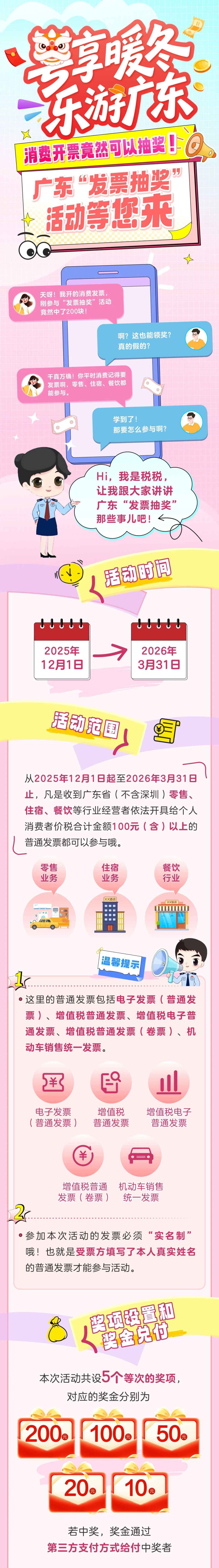 活动期间,个人消费者在广东省内(不含深圳市)进行零售、住宿、餐饮消费时,取得省内经营者依法开具的价税合计金额100元(含)以上的普通发票,包括电子发票(普通发票)、增值税普通发票、增值税电子普通发票、增值税普通发票(卷票)、机动车销售统一发票,均可参与抽奖。