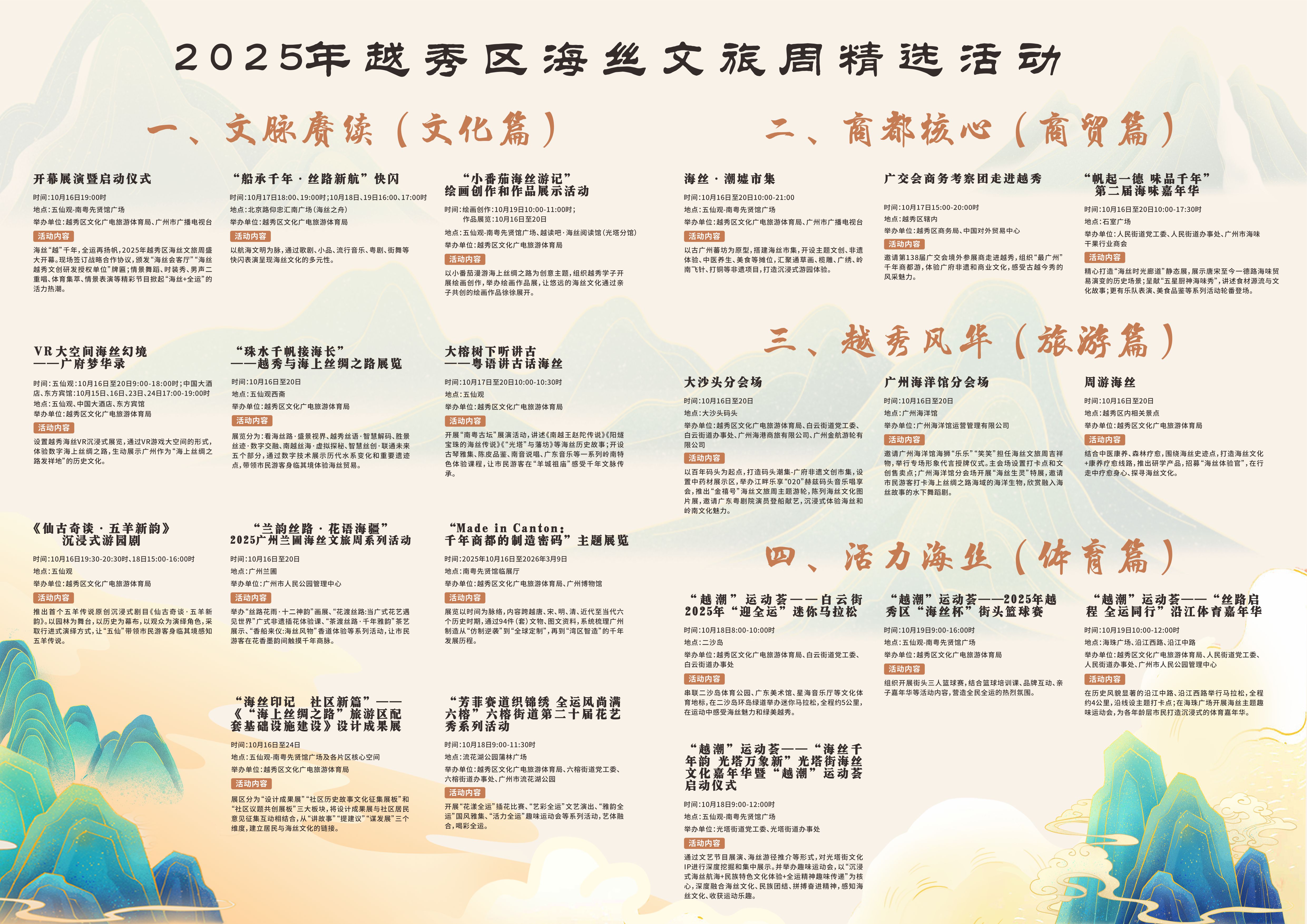 本届海丝文旅周以“帆起南越 丝语千年”为主题,融入全运体育和全域旅游元素,分为活力海丝(体育篇)、文脉赓续(文化篇)、商都核心(商贸篇)、越秀风华(旅游篇)4个篇章,推动文商旅体深度融合,激发全民迎全运热情。活动由广州市文化广电旅游局、广州海丝申遗办、广州市越秀区“百千万工程”指挥部办公室指导,越秀区海丝文旅周系列活动组委会主办。