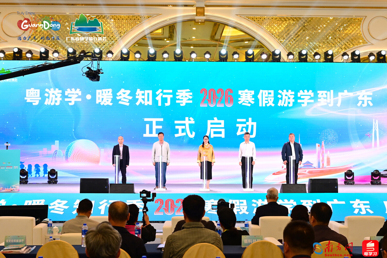 12月12日,由广东省文化和旅游厅、省教育厅、省科技厅、省工业和信息化厅联合主办,广东省研学旅行协会承办的“粤游学·暖冬知行季——2026‘寒假游学到广东’”启动仪式在广州举办。启动仪式在朝气蓬勃的氛围中开场,少年们带来的《南狮奋起》《中华战舞—英歌舞》等表演,生动诠释了传统文化与时代精神的交融。