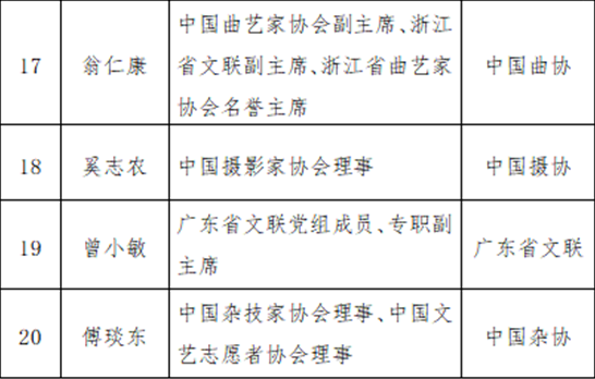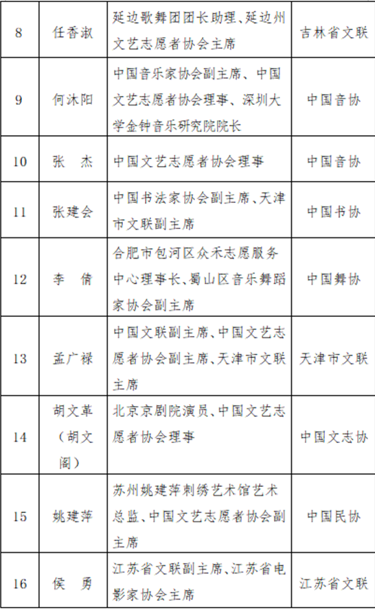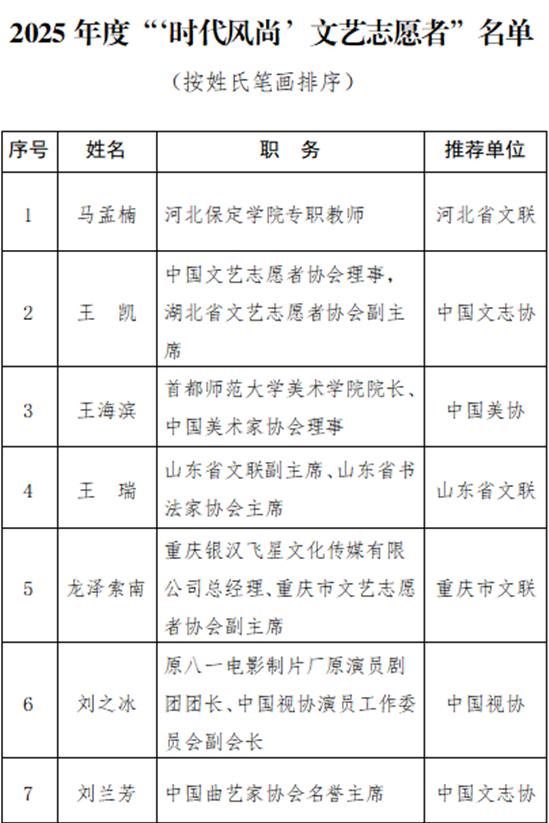 日前,记者从中国文联获悉,为了积极培育和践行社会主义核心价值观,大力弘扬“奉献、友爱、互助、进步”志愿精神,培育志愿文化,发挥文艺志愿者先进典型示范引领作用,引导全社会向先进典型学精神、学品质、学方法,推动形成崇尚先进、见贤思齐的浓厚氛围,经中央宣传部批准,中国文联首次开展了2025年度“‘时代风尚’文艺志愿者”宣传选树活动。经中国文联各团体会员推荐、专家推选、社会公示等环节,推选出2025年度“时代风尚”文艺志愿者20人,现予以公布。