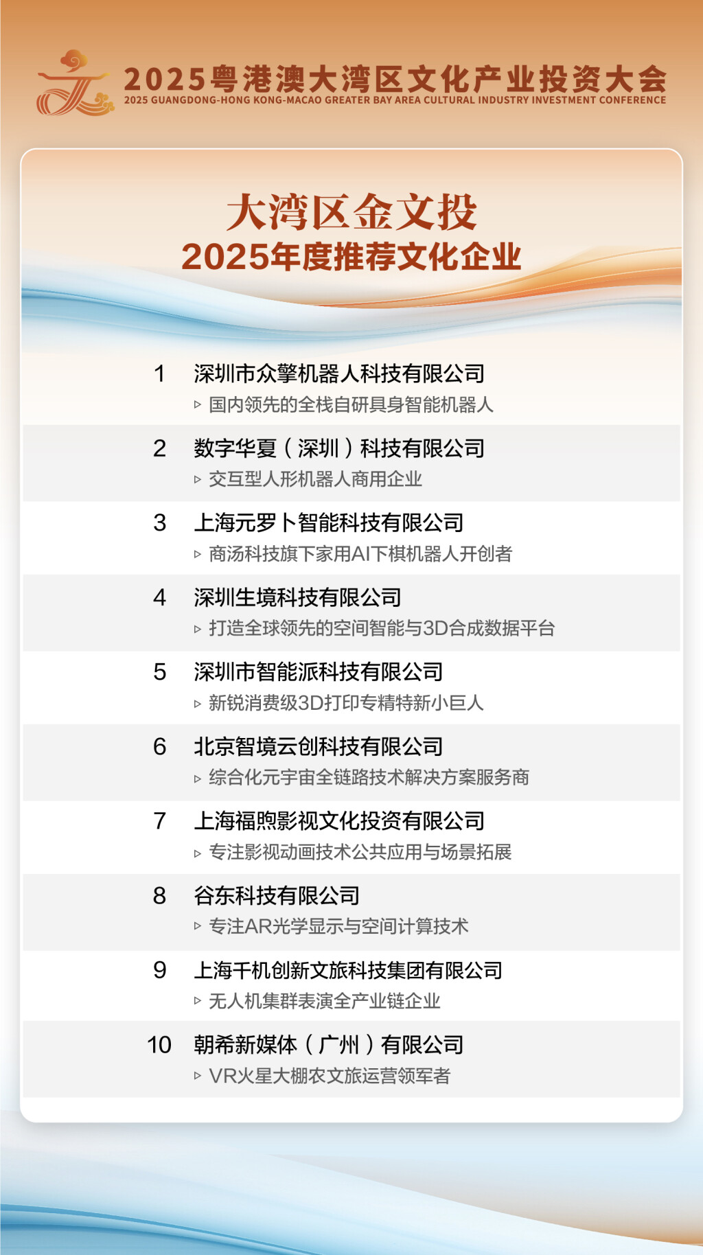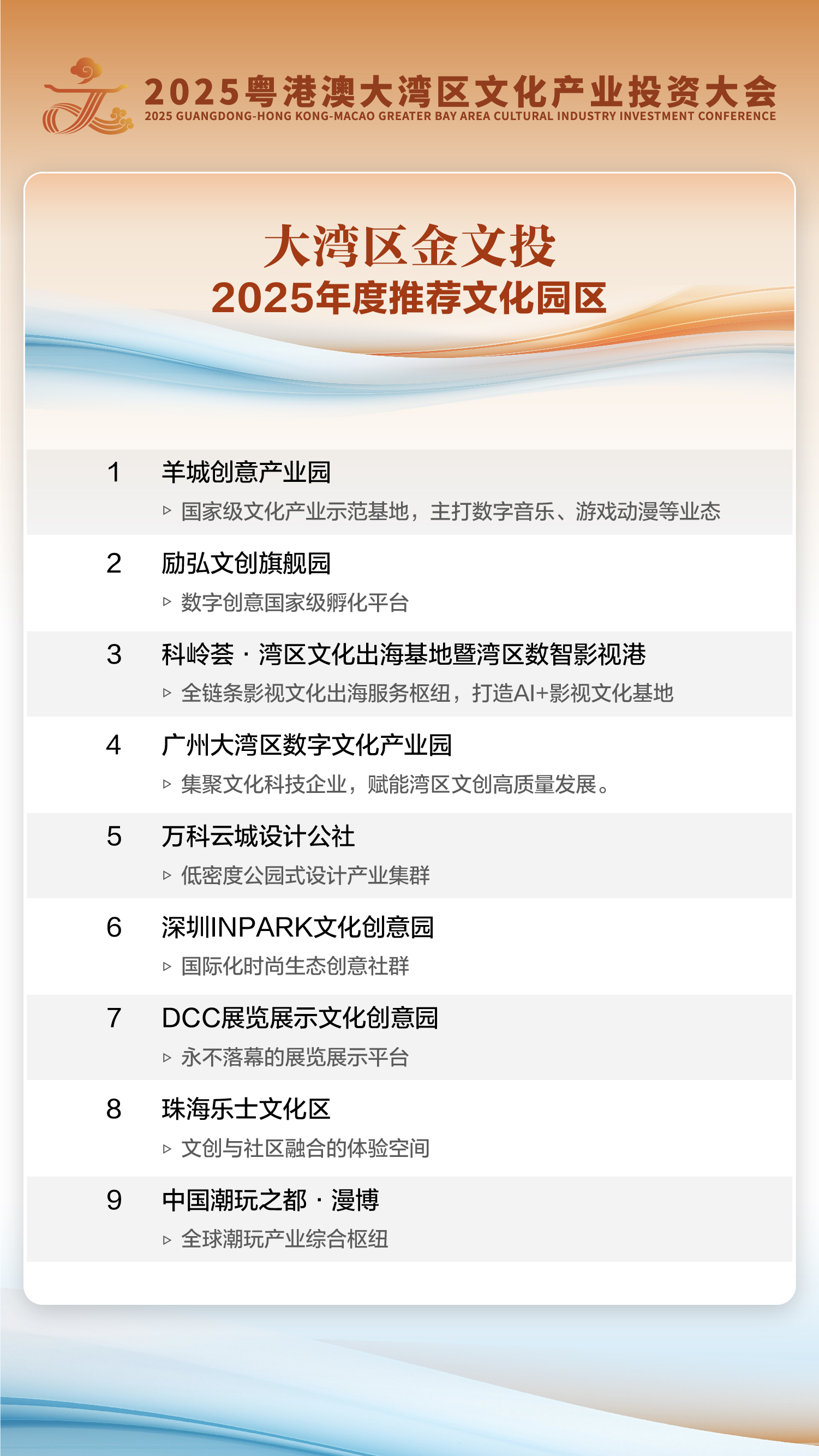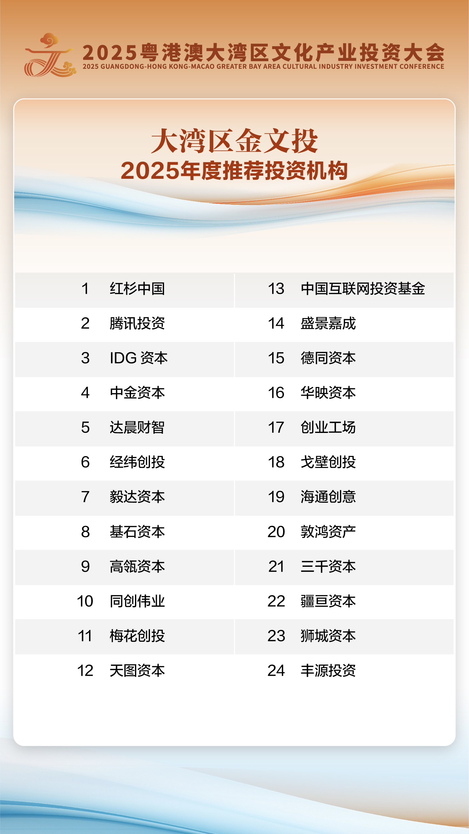 此外,会上还发布了“大湾区金文投”2025年度典型案例,涵盖文化企业、园区以及投资机构三方面。其中10家企业入选“大湾区金文投2025年度推荐文化企业”,9个园区为“大湾区金文投2025年度推荐文化园区”,最终选出24家投资机构为“大湾区金文投2025年度推荐投资机构”。