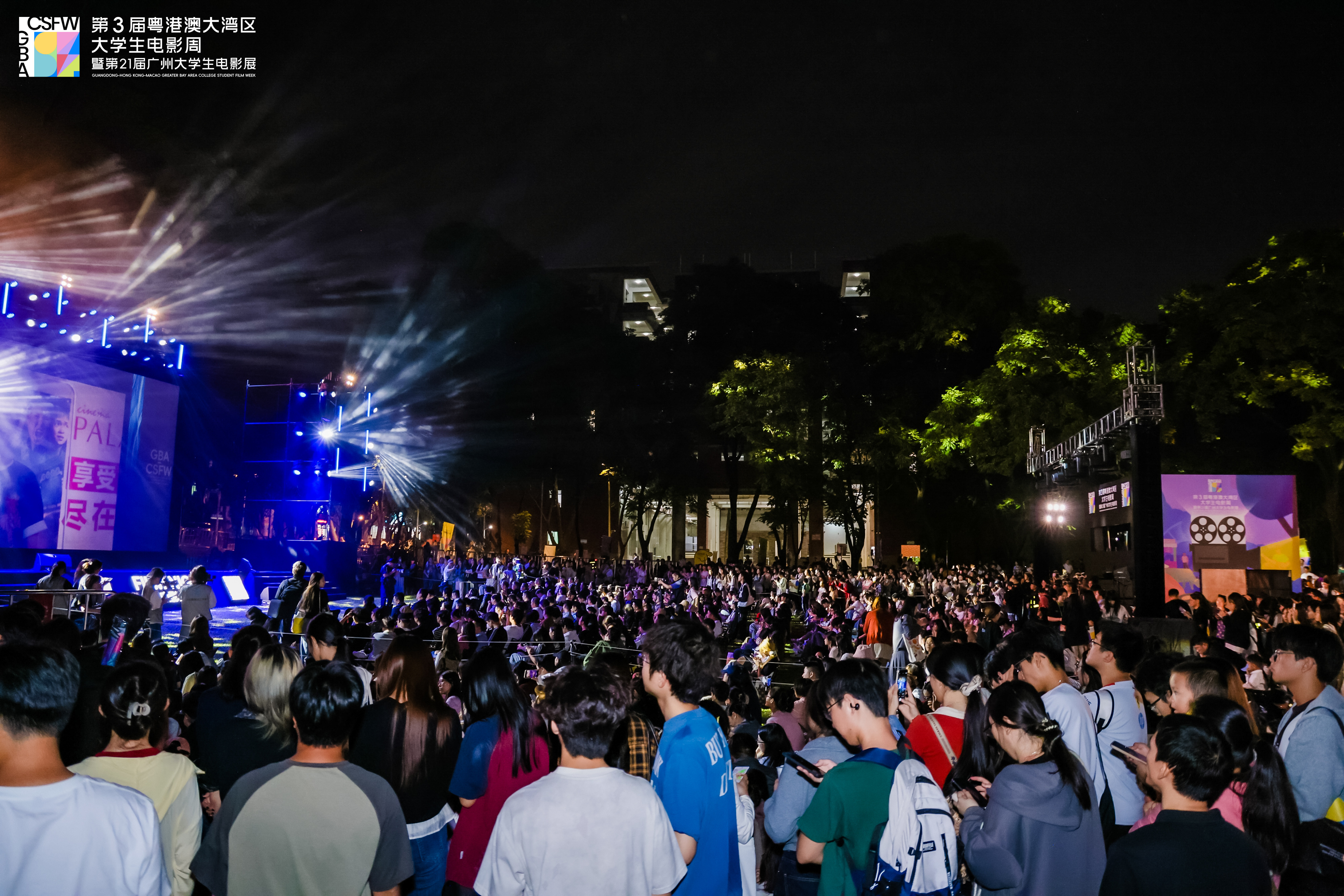 11月1日晚,第3届粤港澳大湾区大学生电影周暨第21届广州大学生电影展“晚风FUN映”电影之夜在华南农业大学举办。来自粤港澳三地的师生与电影业界嘉宾齐聚一堂,以一场融合文创市集、音乐演出、荣誉颁授与露天观影的沉浸式电影文化盛宴,为历时两周的电影周画上充满活力与温度的句点。