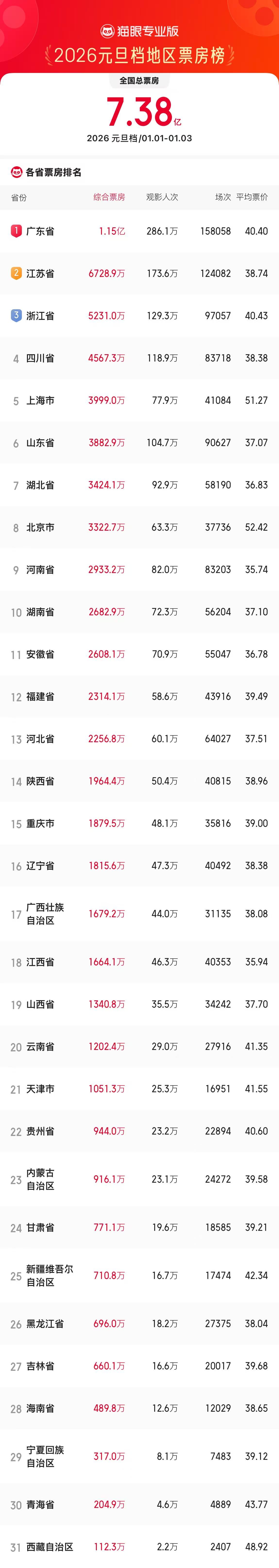 2026年元旦档(1月1日至3日)全国电影市场以稳健表现开局。据猫眼专业版数据,元旦档全国总票房报收7.39亿元。广东省表现尤为突出,票房收入达1.16亿元,成为全国唯一票房破亿元的省份,占全国总票房的15.64%,观影人次达286.1万,亦居全国第一。