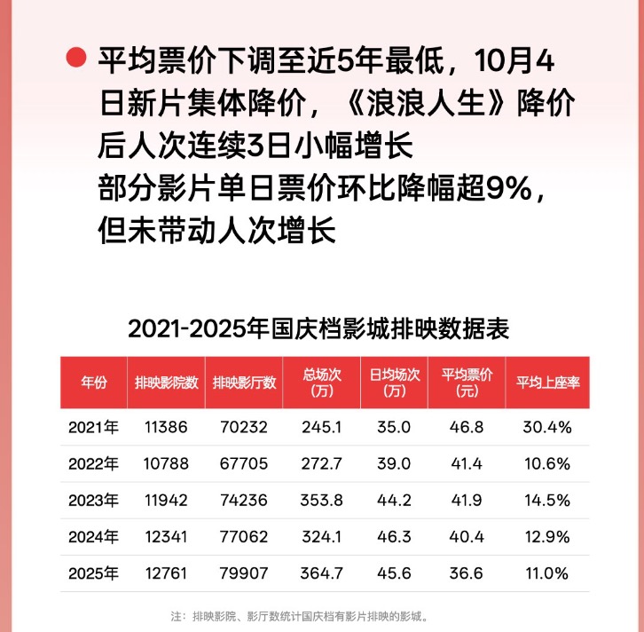 2025年国庆档(10月1日至8日)总票房为18.35亿元,总观影人次5007万。今年国庆档的平均票价也为近五年最低,多部新片自10月4日起调低发行结算价,部分影片票价降幅超9%。整个档期内,单日票房走势相对平稳。
