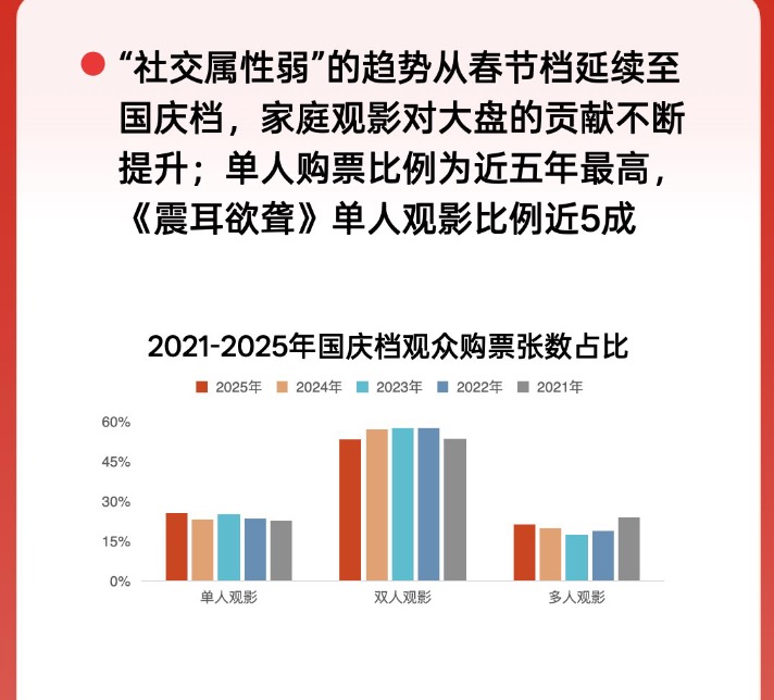 用户行为方面,电影消费“社交属性弱化”的趋势进一步延续。人均观影部数同比下降,双人观影比例下降,而单人观影比例则达到近五年最高。影片《震耳欲聋》的单人观影比例近五成,粉丝属性明显。《志愿军:浴血和平》《三国的星空第一部》等影片多人观影占比较高,家庭观影属性较强。